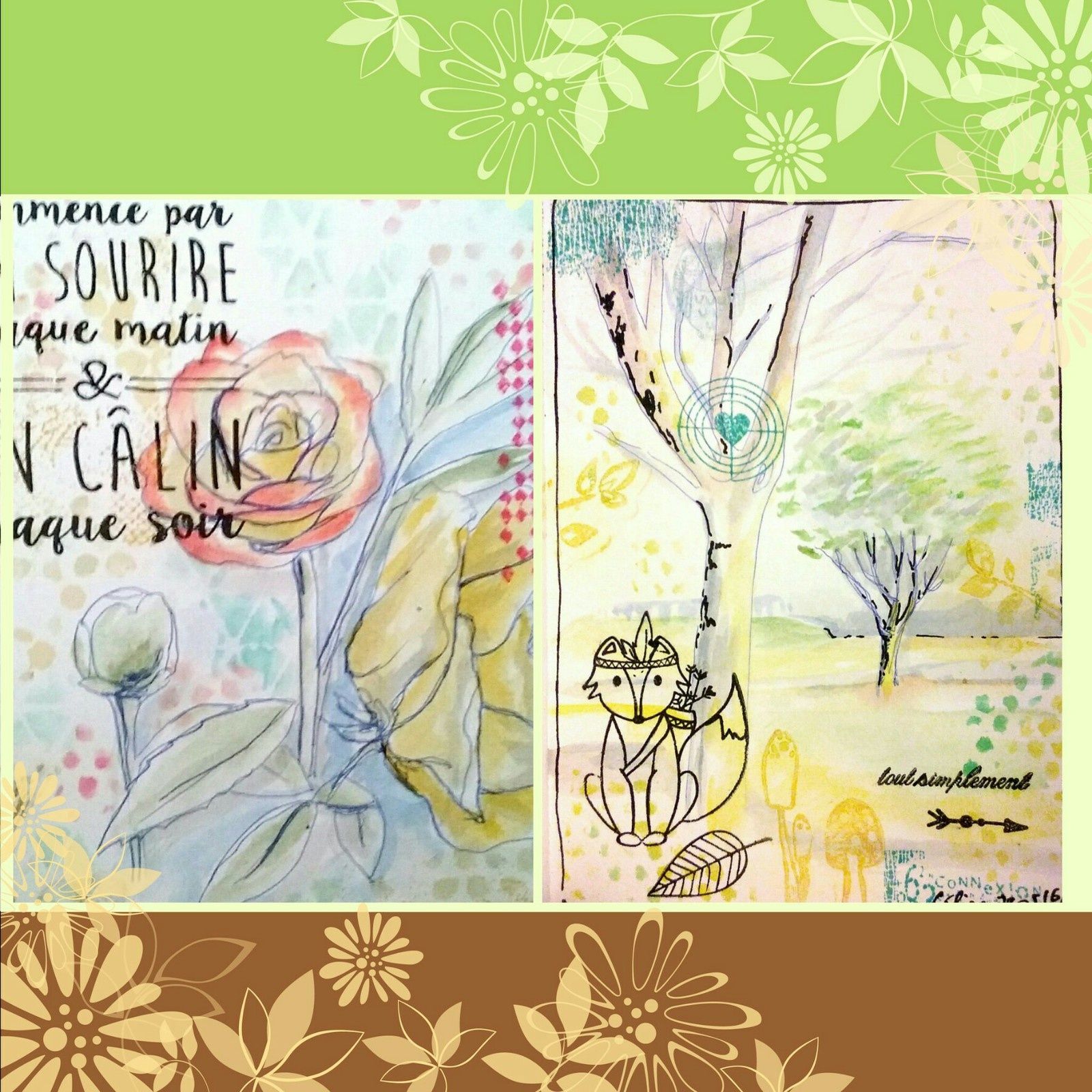 La deuxième page a toujours la même base : un dessin aquarelle.La nature y est le sujet.A bientôt.